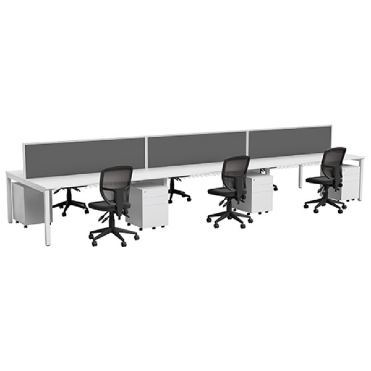 The Linear 6 Way desk cluster with white Melamine tops, grey upholstered screens with aluminium frames and double steel End-legs.